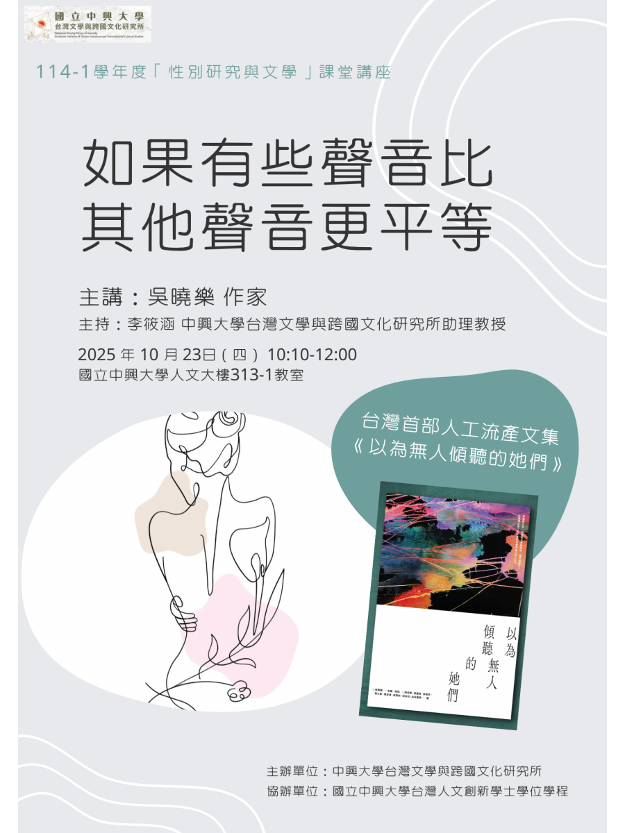 【課堂演講】如果有些聲音比其他聲音更平等 學術活動 如果有些聲音比其他聲音更平等 講者:吳曉樂(作家) 主持人:李筱涵(中興大學台灣文學與跨國文化研究所助理教授) 日期:2025年10月23日 時間:10:10-12:00 地點:國立中興大學人文大樓313-1教室 主辦單位:國立中興大學台灣文學與跨國文化研究所 協辦單位:國立中興大學台灣人文創新學士學位學程