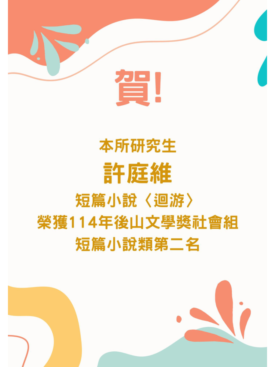賀!!本所研究生許庭維榮獲114年後山文學獎社會組短篇小說類第二名。