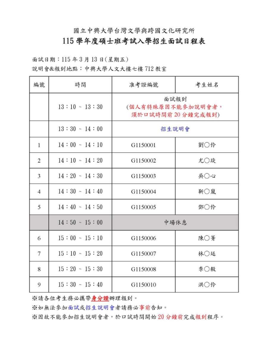 【招生】115學年度碩士班考試入學面試日程表