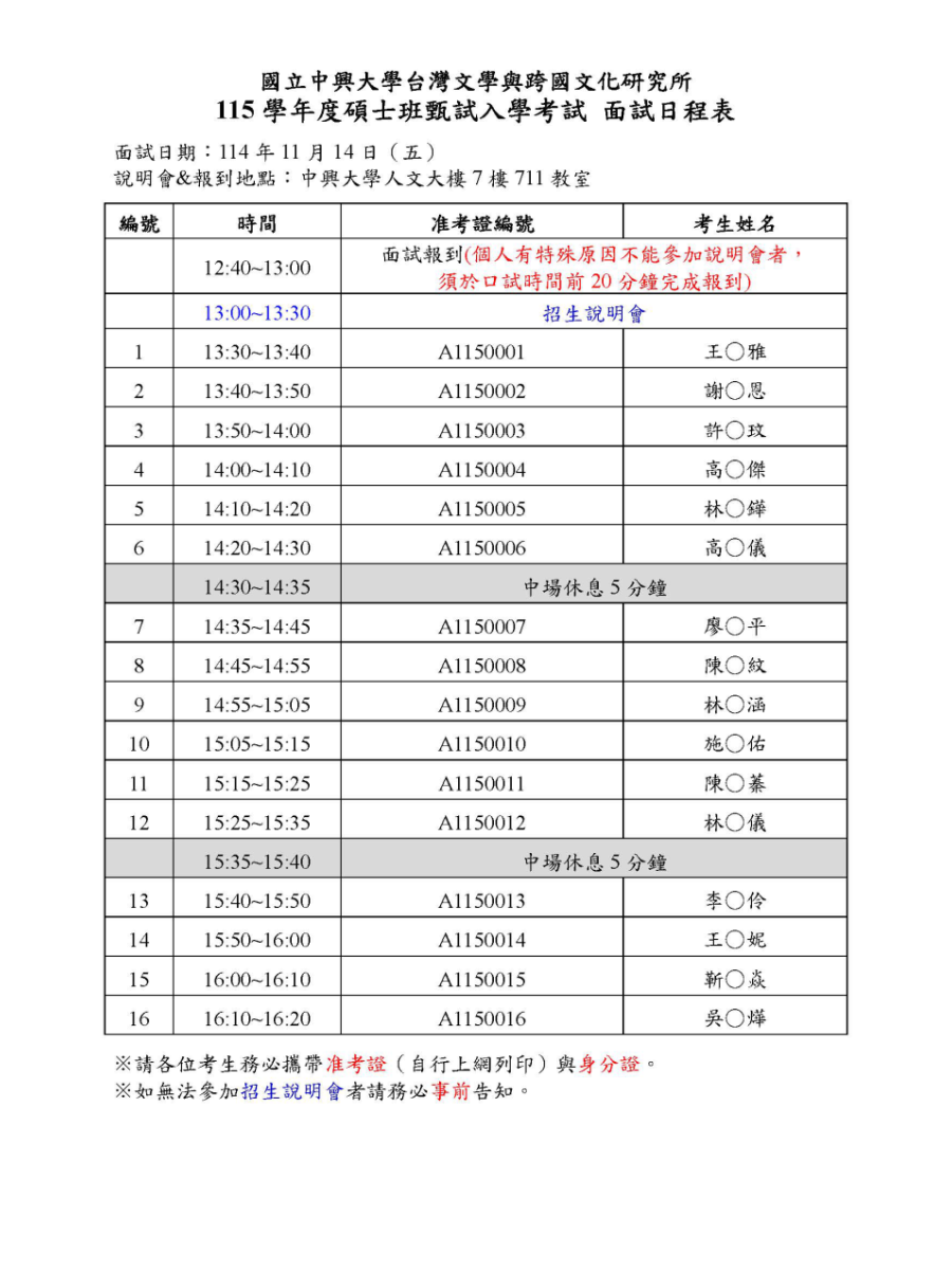 【招生】115學年度碩士班甄試入學招生面試日程表