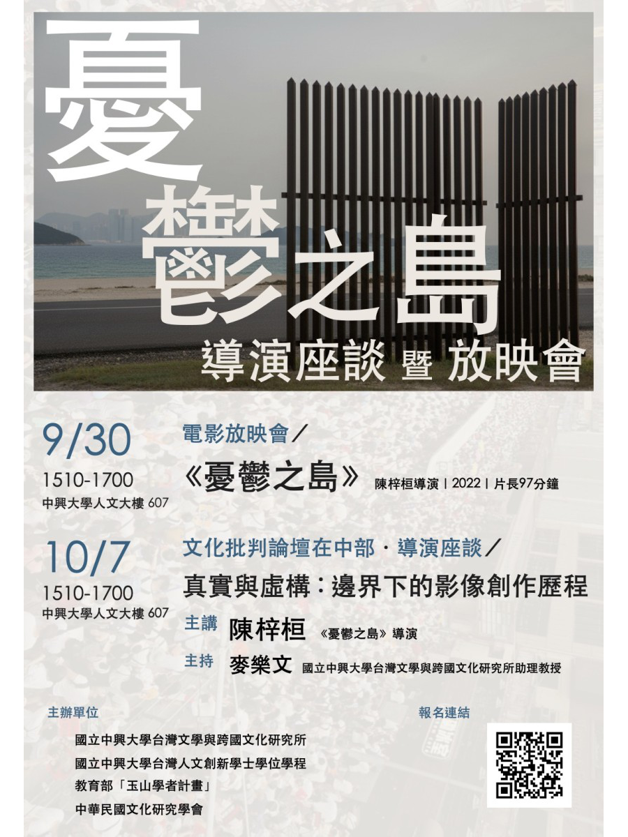 《憂鬱之島》導演講座暨放映會 學術活動 電影放映會/《憂鬱之島》 日期:9/30(二) 時間:15:10-17:00 地點:國立中興大學 人文大樓 607 文化批判論壇在台中/真實與虛構:邊界下的影像創作歷程 主講:陳梓桓《憂鬱之島》導演 主持:麥樂文 國立中興大學台灣文學與跨國文化研究所助理教授 日期:10/7(二) 時間:15:10-17:00 地點:國立中興大學 人文大樓 607 主辦: 國立中興大學台灣文學與跨國文化研究所 國立中興大學台灣人文創新學士學位學程 教育部「玉山學者計畫」 中華民國文化研究學會