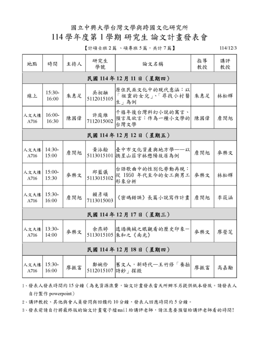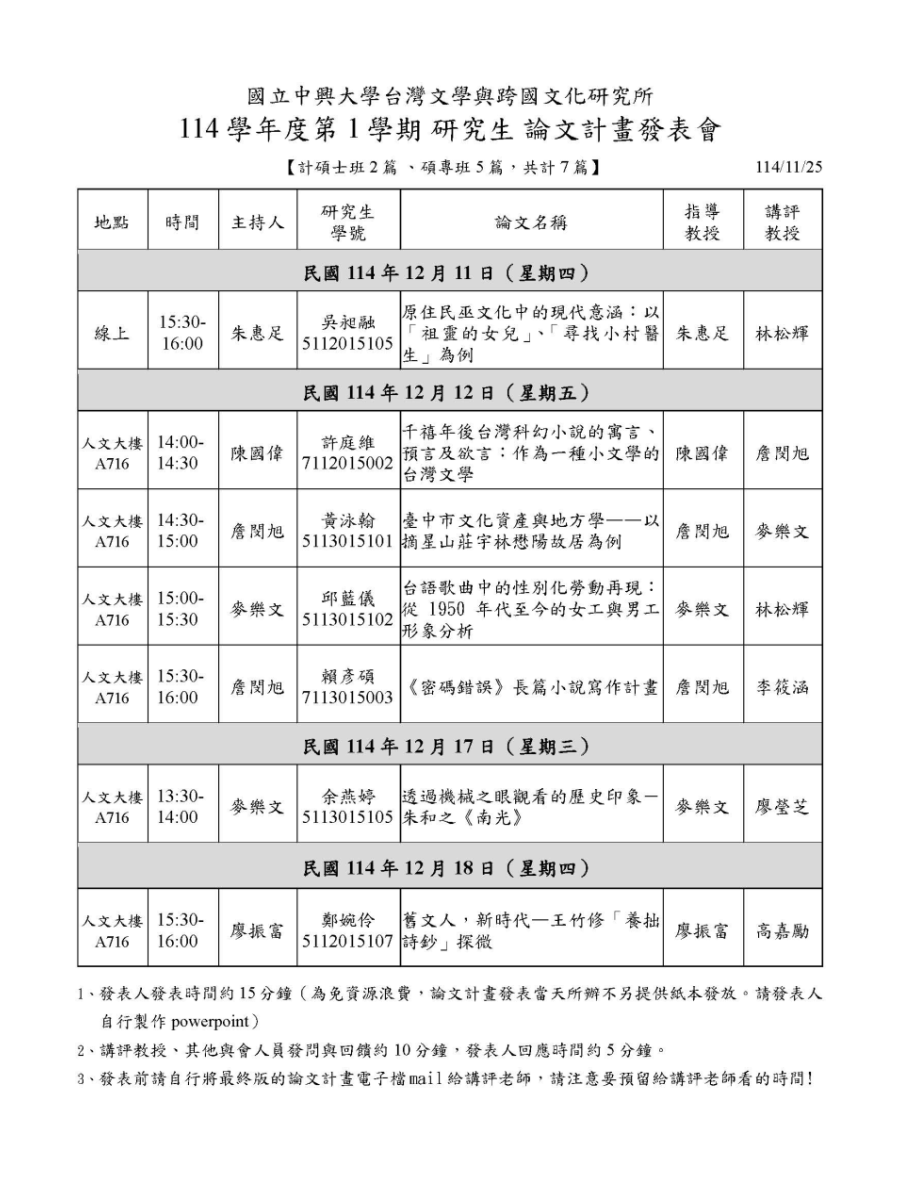 【公告】114學年度第1學期研究生論文計畫發表會 所辦公告 【注意事項】 發表人發表時間約15分鐘(為免資源浪費,論文計畫發表當天所辦不另提供紙本發放。請製作powerpoint) 講評教授、其他與會人員發問與回饋約10分鐘,發表人回應時間約5分鐘。 發表前請自行將最終版的論文計畫電子檔mail給講評老師,請注意要預留給講評老師看的時間! 論文計畫發表 下載