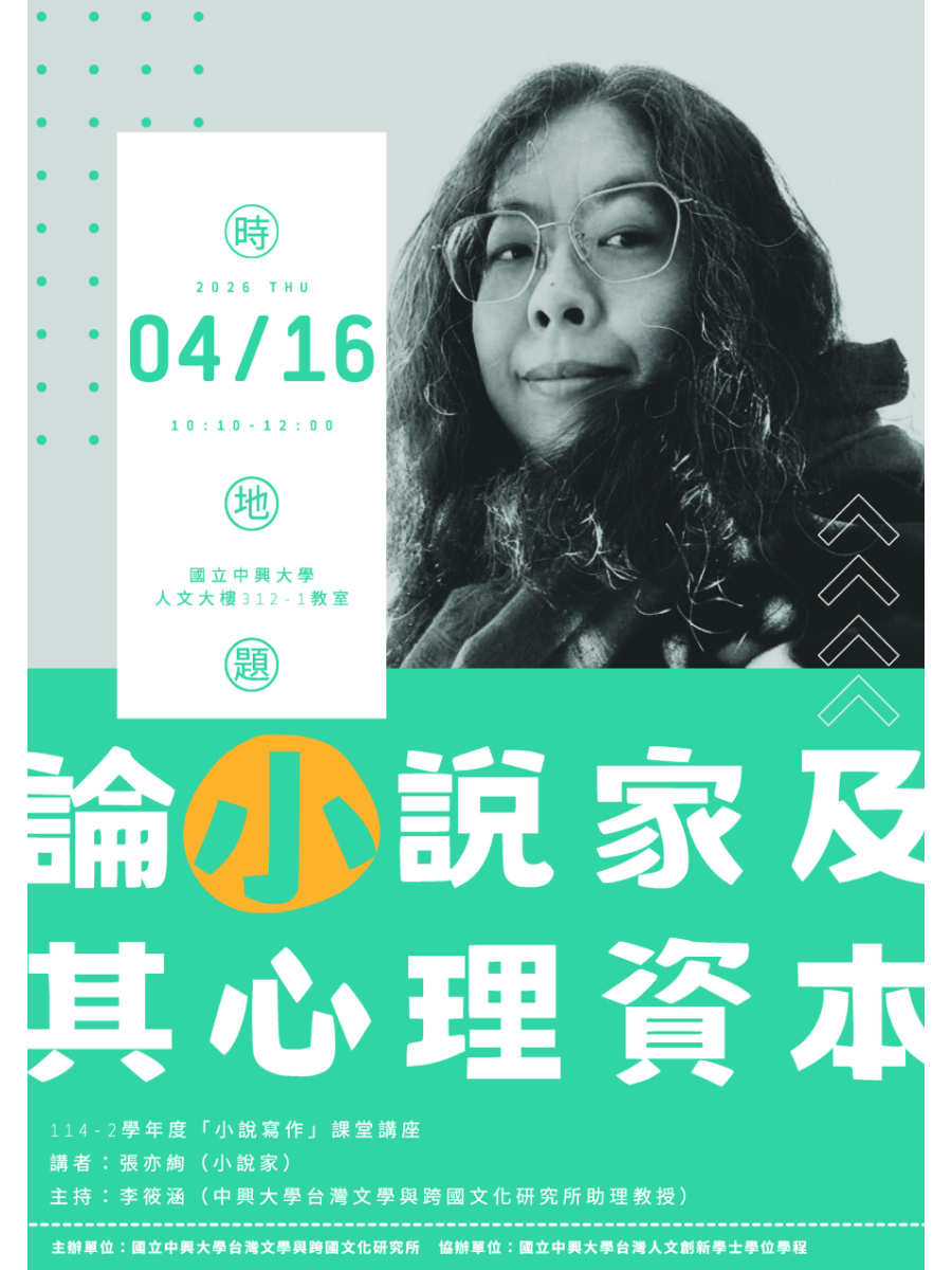 【課堂講座】論「小」說家及其心理資本 學術活動 論「小」說家及其心理資本 主講:張亦絢 (作家) 主持:李筱涵 (中興台文所助理教授) 時間:2026年4月16日(四)10:10-12:00 地點:國立中興大學人文大樓312-1教室 主辦單位:國立中興大學台灣文學與跨國文化研究所 協辦單位:國立中興大學台灣人文創新學士學位學程