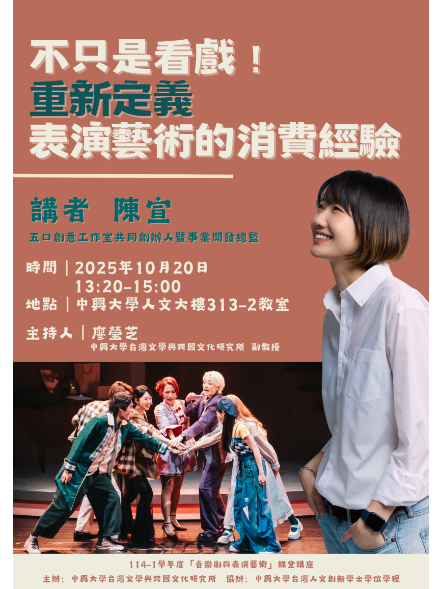 114-1學年度「音樂劇表演藝術」課堂講座 學術活動 講題:不只是看戲!重新定義表演藝術的消費經驗 講者:陳宣 (五口創意工作室共同創辦人暨事業開發總監) 主持人:廖瑩芝(中興大學台灣文學與跨國文化研究所副教授) 日期:2025年10月20日 時間:13:20~15:00 地點:中興大學人文大樓313-2教室 主辦單位:國立中興大學台灣文學與跨國文化研究所 協辦單位:國立中興大學台灣人文創新學士學位學程