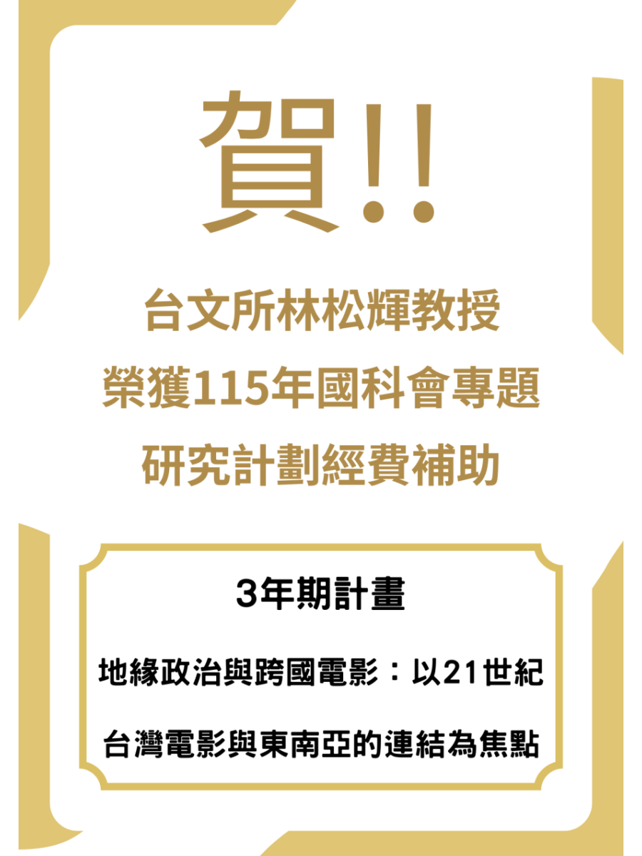 賀!! 林松輝教授榮獲115年國科會專題研究計劃經費補助 所辦公告 賀!! 台文所林松輝教授榮獲115年國科會專題研究計劃經費補助 地緣政治與跨國電影:以21世紀台灣電影與東南亞的連結為焦點 / 3年期計畫